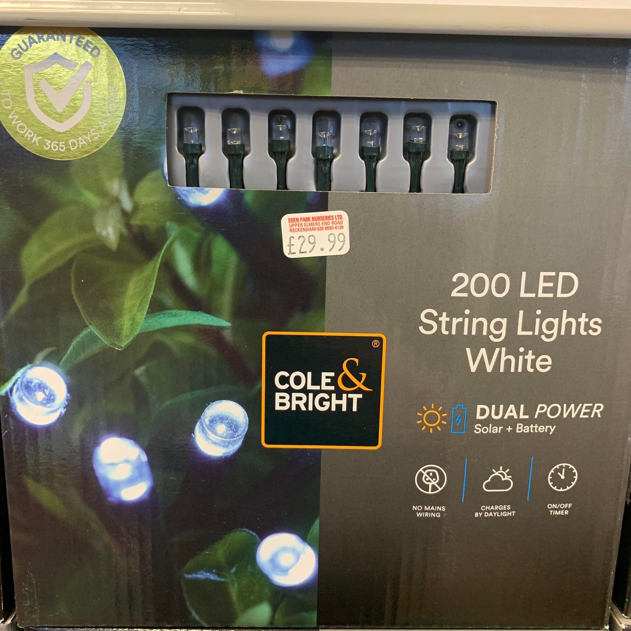 200 LED White string lights. Perfect for in and outdoor lights. Solar and battery