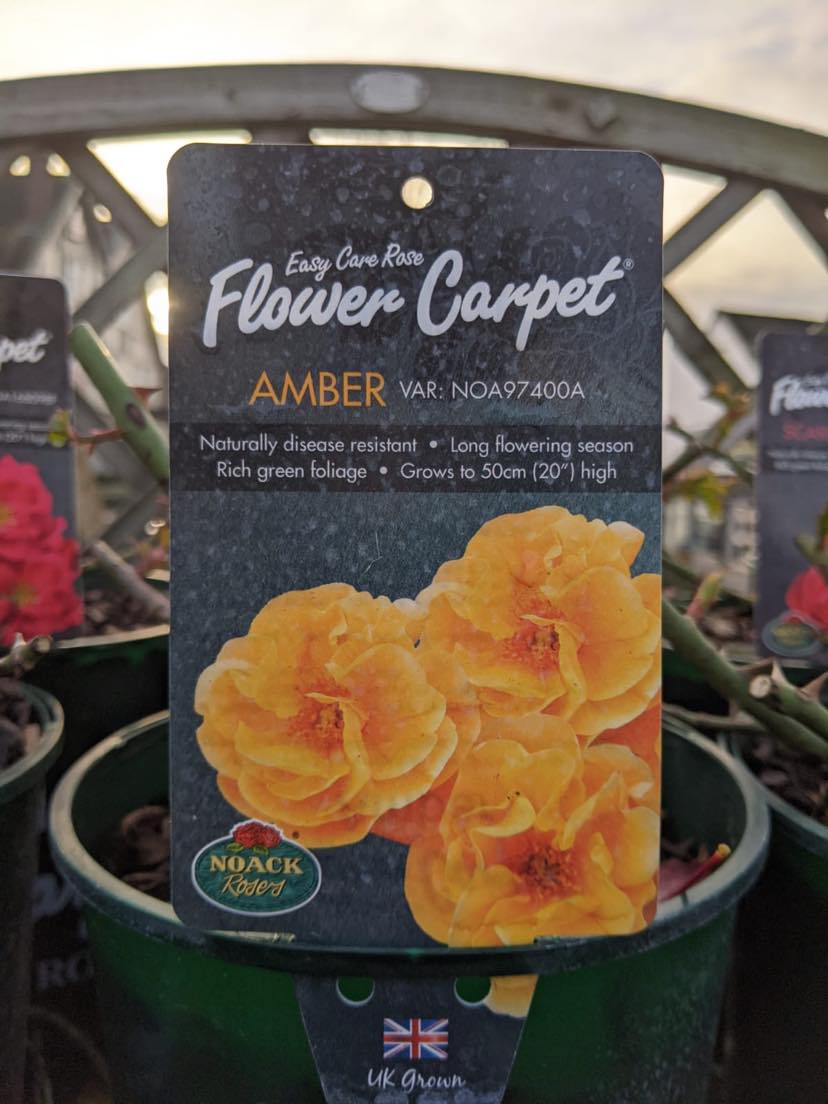 Rosa Flower Carpet Amber  is a low-growing rose with a rounded habit. It bears semi-double, slightly scented flowers in clusters through summer and autumn. They are a soft apricot-gold in colour aging to a pinkish-peach.