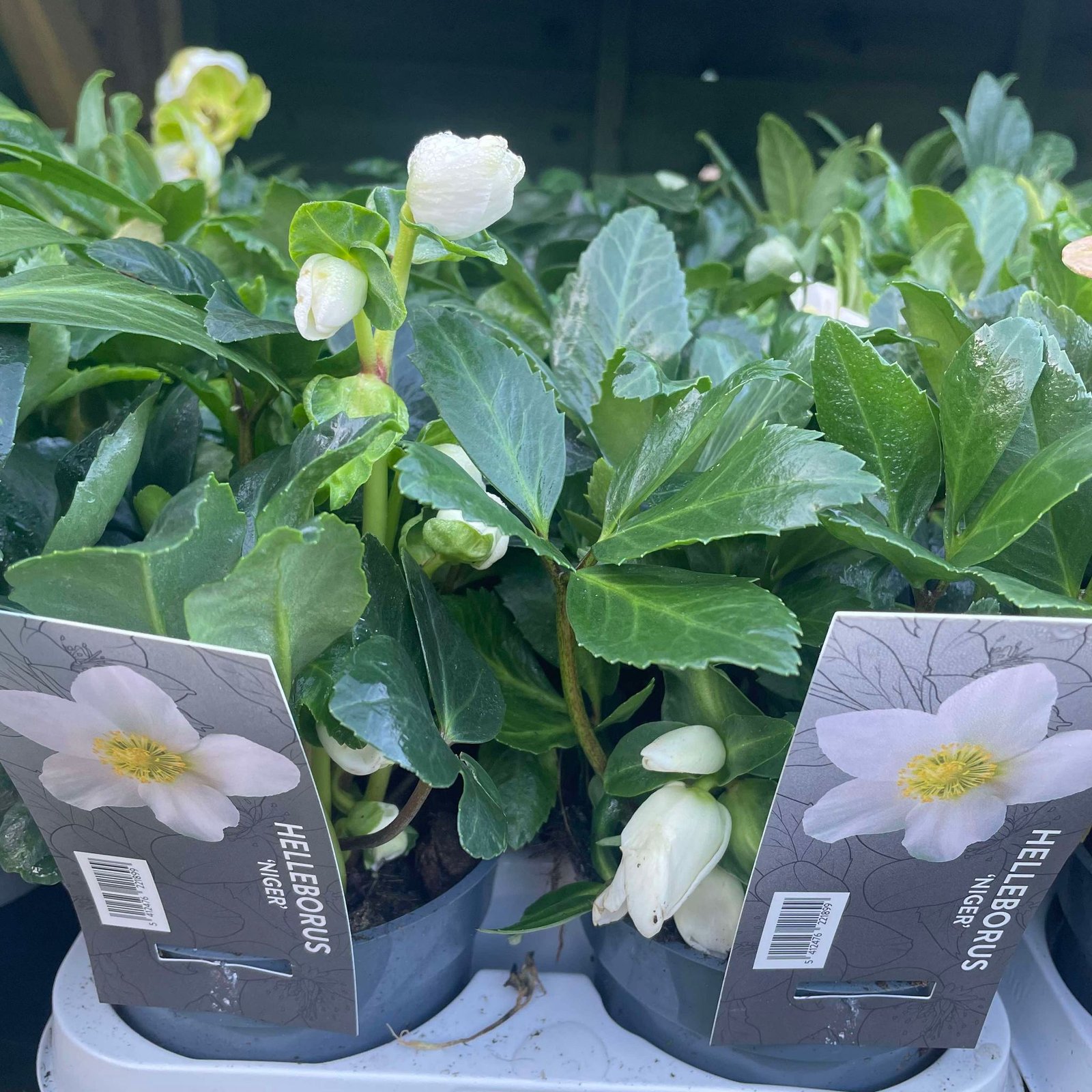Just above dark green, leathery leaves stand white, wide-open blooms, sometimes tinged pink. They need retentive but well-drained soil, in sun or part shade, top dressed with old manure or compost.