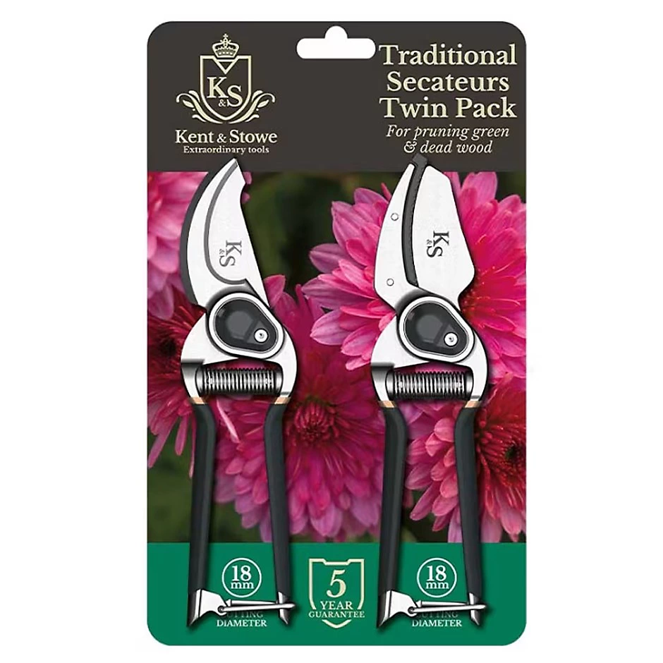 This twin pack of Traditional Secateurs includes one bypass and one anvil for all your cutting tasks around the garden. The bypass pair are ideal for deadheading, taking cuttings as well as the general pruning of live, green wood. The anvil secateurs are ideal for pruning mature, hard and also dead wood. Both are made from drop forged, high quality carbon steel and come with a confident 5 year guarantee. Features: Pack includes one bypass and one anvil pair of secateurs Bypass is ideal for deadheading, taking cuttings and general pruning of live, green wood Anvil is ideal for pruning mature, hard and dead wood Both made from drop forged, high quality carbon steel Cutting Diameter 18mm