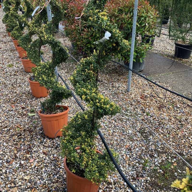 A beautiful topiary spiral shaped from Ligustrum Jonandrum. It produces abundant creamy white flowers with a rather unusual scent in late summer and small, black berries in autumn.