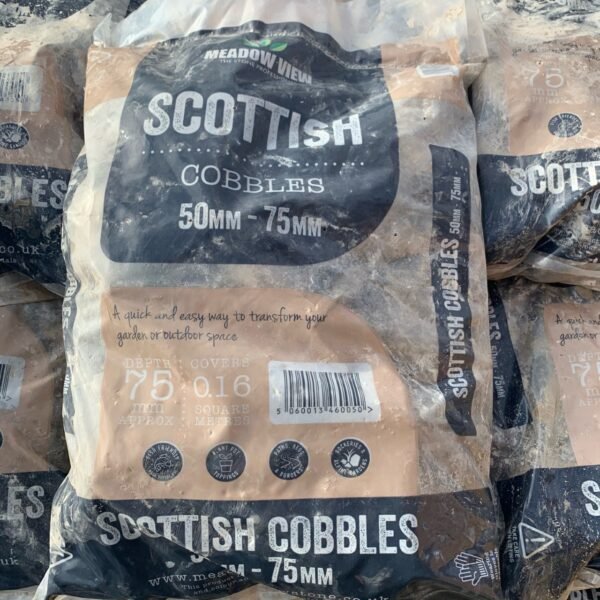 Meadow view scottish cobbles. 50mm-75mm. Depth 57mm approx. covers 0.16 square metres. A quick and easy way to fransform your garden or our door space. Suitable for driveways, fish friendly, ideal for borders and paths, decorative for pots, ideal for rockeries and alpine gardens.