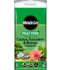 Miracle-Gro® Peat Free Premium Cactus, Succulent & Bonsai Compost Premium Compost is a premium peat free compost, specially formulated to cater the needs of plants like cacti, succulents, bonsai, alpines and African violets that prefer slightly acid growing conditions. The unique blend with sand improves drainage and provides all the nutrients, NPK and trace elements for the plants to grow healthy and thrive.