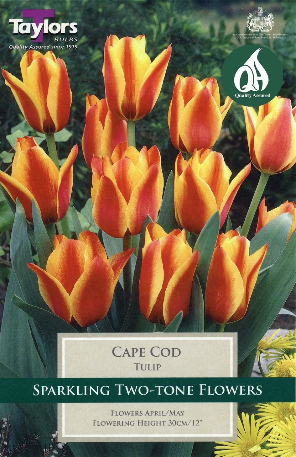 The Cape Cod Tulip is Greigii Variety. They are sparkling two-tone flowers, orange-edged with yellow. Plant from August onward to flower in April/May.