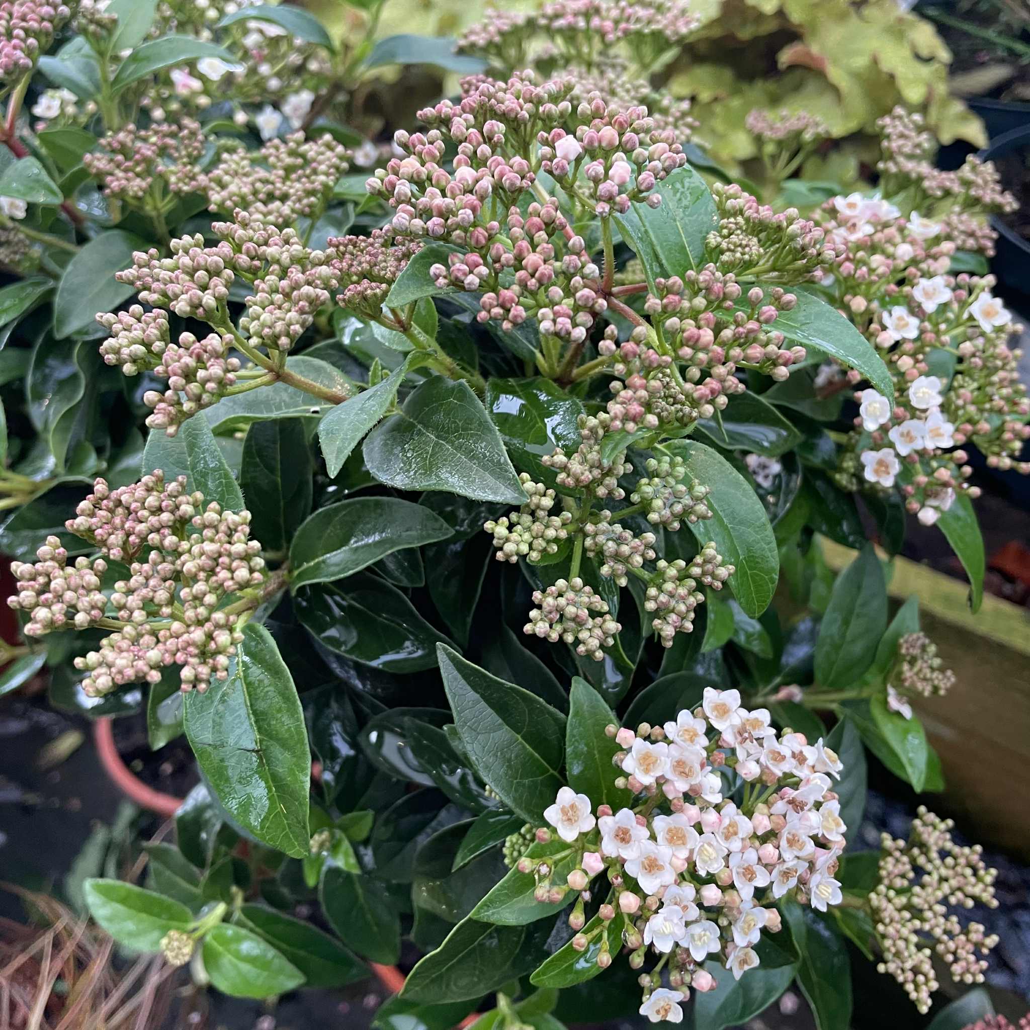 Viburnum tinus is a versatile and dependable evergreen shrub, prized for its year-round structure and long season of interest. From autumn through spring, clusters of pink-flushed buds open into fragrant white flowers, often when little else is blooming. These are followed by metallic blue-black berries that attract birds. With its glossy dark green foliage and easy-care nature, Viburnum tinus is ideal for hedging, borders, or as a backdrop in mixed planting schemes.